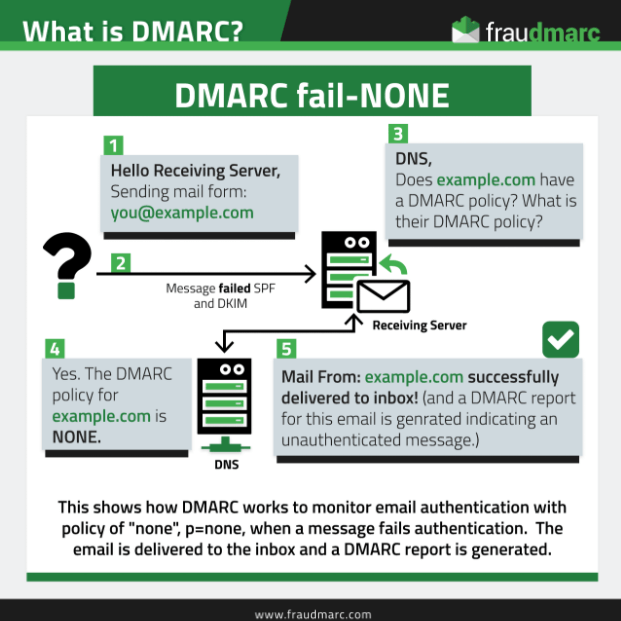 - None – allows monitoring only without interrupting the flow of email. It’s the first step towards securing the domain. Emails can still be spoofed as the company identifies email sending services through DMARC reports. NOTE: this is distinct from having no policy, which means the domain does not use DMARC and cannot see when attackers spoof their domain.