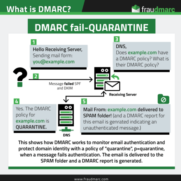 - Quarantine– allows for a “soft block” on spoofed emails. It’s the intermediate step that allows companies to double-check configurations. Spoofed emails go to the recipient’s spam folder, and DMARC reports inform the company about it.
