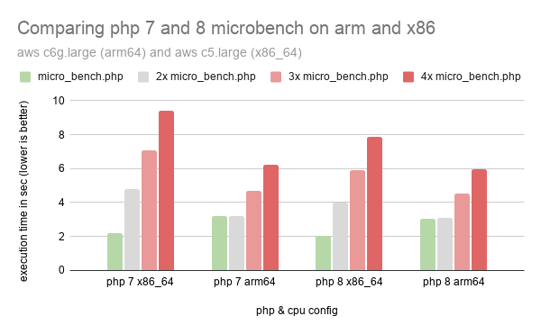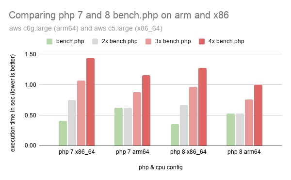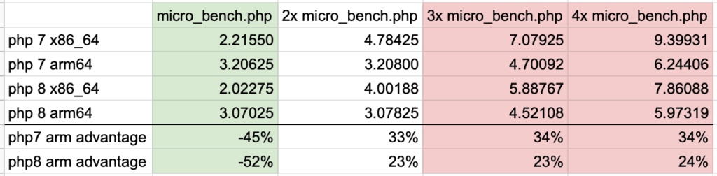 The green column reveals what AWS omitted: single-threaded php is 50% slower on arm64 “Graviton2” instances. Ouch. But that’s not the whole story.