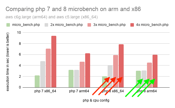 x86 (green arrow) was faster than arm (red arrow) core-for-core. Our test instances each had 2 vCPUs which meant only a single true vCPU core on x86 and two cores on arm. At concurrency level 1, the single x86 core runs php fastest.