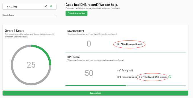 STCU is not the only bank to neglect email security. Check Fraudmarc’s email security score for your bank or credit union. Unfortunately, it is too common for banks to lack basic email security.