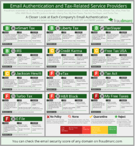 According to a study by the Global Cyber Alliance, some of the top tax-related services providers don’t secure their domains with DMARC, leaving them open to phishing attacks. Fraudmarc examines the email security scores of many top tax related service providers.
