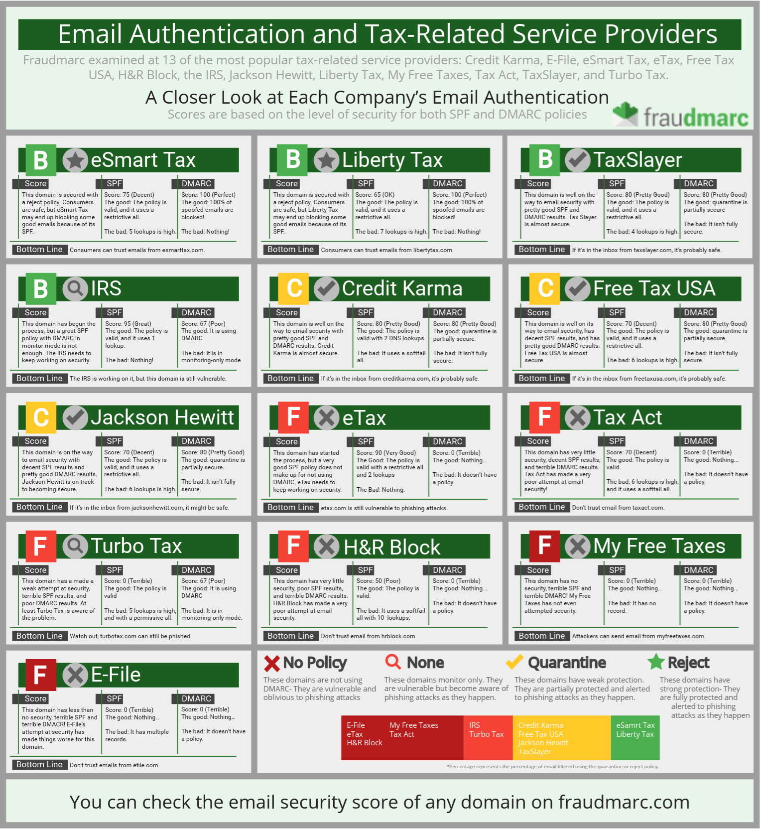 According to a study by the Global Cyber Alliance, some of the top tax-related services providers don’t secure their domains with DMARC, leaving them open to phishing attacks. Fraudmarc examines the email security scores of many top tax related service providers.